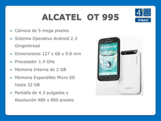 El documento describe las especificaciones técnicas de varios teléfonos móviles Alcatel. Los modelos incluyen el OT 995 con cámara de 5MP y Android 2.3, el OT 991 con procesador de 800MHz y pantalla de 4 pulgadas, y el OT 918 con cámara de 3.2MP y pantalla táctil de 3.2 pulgadas. También se enumeran las características del OT 5020 con Android 4.1, el OT 5035 con cámara de 5MP y Android 4.0, y el OT 4
