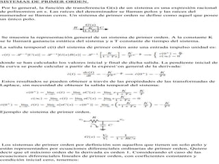 Este documento resume los sistemas de control de primer orden, segundo orden y orden superior. Explica que los sistemas de primer orden tienen un solo polo, mientras que los sistemas de segundo orden tienen dos polos. Luego describe cómo los sistemas de segundo orden pueden ser subamortiguados, sobreamortiguados o críticamente amortiguados dependiendo de sus parámetros. Finalmente, explica que para sistemas de orden superior, la respuesta depende principalmente de los polos más lentos o dominantes.