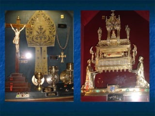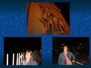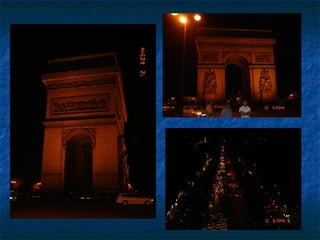 El documento resume varios lugares emblemáticos de París como la Ópera de París Garnier, el Arco del Triunfo, la Torre Eiffel y la catedral de Notre Dame, así como otros sitios como el metro, el río Sena, el Palacio de Justicia y el Louvre. Incluye fotos y descripciones breves de cada lugar, destacando detalles arquitectónicos e historia.