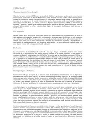 El documento proporciona información sobre el origen, composición química, efectos y riesgos del alcohol. Explica que el alcohol ha sido consumido por miles de años en culturas antiguas y se obtiene de la fermentación de diversos productos como la cebada, uvas y maguey. Químicamente, el alcohol etílico es el componente psicoactivo principal y su consumo causa efectos como euforia, pérdida de coordinación y daños a largo plazo en el hígado y sistema nervioso si se consume en exceso