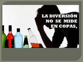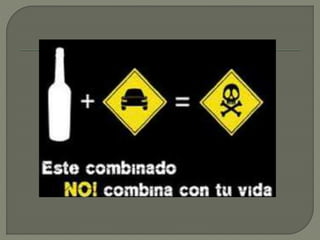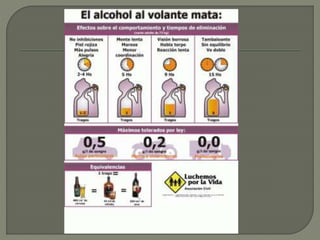 El documento trata sobre los efectos del alcohol en el cuerpo y la conducción. Explica que el alcohol es un depresor del sistema nervioso central que afecta la síntesis y liberación de neurotransmisores en el cerebro. Describe que el alcohol se absorbe rápidamente en el estómago y llega al cerebro en minutos, donde causa los mayores efectos como la reducción de la coordinación motora y los reflejos. Además, enfatiza que no existe un nivel seguro de alcohol para conducir y que incluso por debajo del límite legal el ries