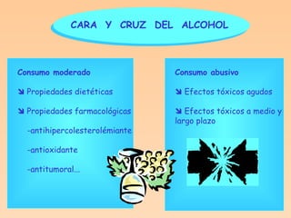 El documento trata sobre los efectos del alcohol y el alcoholismo. Describe los efectos del consumo moderado y abusivo de alcohol, así como las complicaciones y trastornos relacionados con el consumo a largo plazo como la cirrosis hepática, la miopatía alcohólica y el síndrome alcohólico fetal. También analiza datos sobre el consumo de alcohol entre los jóvenes españoles y los riesgos asociados al consumo abusivo.