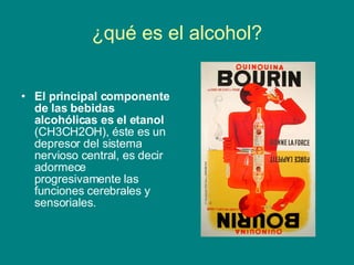 El documento proporciona información sobre los efectos del alcohol en el cuerpo y el comportamiento. El alcohol es un depresor del sistema nervioso central que inicialmente produce euforia pero luego adormece las funciones cerebrales. Su consumo aumenta el riesgo de accidentes, agresividad y otros comportamientos de los que luego no se tiene memoria. Los niveles altos de alcohol en la sangre pueden causar estupor, coma e incluso la muerte.