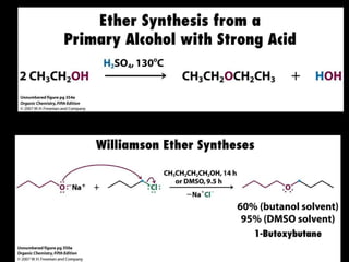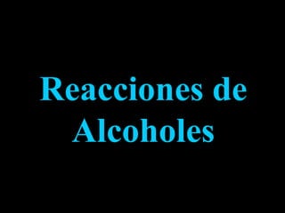 El documento proporciona una introducción a las reacciones de los alcoholes, incluyendo la deshidratación, oxidación y reacciones con haluros de hidrógeno. También describe métodos para determinar el alcohol en la sangre, como el método de Widmark, y propiedades y reacciones de otros compuestos relacionados como glicoles, fenoles y éteres.