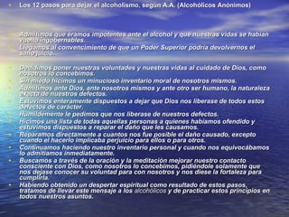 Los 12 pasos de Alcohólicos Anónimos para dejar el alcoholismo incluyen: 1) Admitir que son impotentes ante el alcohol y que sus vidas se han vuelto ingobernables, 2) Llegar a la convicción de que un Poder Superior podría devolverles el sano juicio, y 3) Decidir poner su voluntad y vida al cuidado de Dios tal como lo conciben.