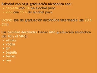 Este documento habla sobre los riesgos del consumo de alcohol entre los jóvenes. Explica que cuanto mayor es la graduación alcohólica de las bebidas, mayor es la cantidad de alcohol puro que contienen. Luego detalla cómo el alcohol afecta el sistema nervioso central y cómo se metaboliza en el cuerpo a través del hígado. Finalmente, enumera algunos riesgos comunes asociados con el consumo excesivo de alcohol y ofrece consejos sobre qué hacer en caso de que alguien se emborrache.