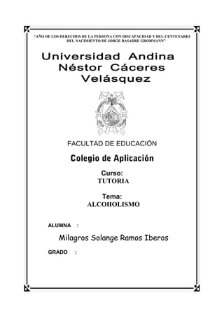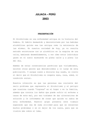 El documento habla sobre el alcoholismo y sus efectos. Explica que el alcoholismo es una enfermedad crónica causada por el consumo excesivo de alcohol que afecta la salud física y mental de la persona. También causa problemas en las relaciones familiares y sociales. Describe los efectos inmediatos del alcohol en el cuerpo y algunas de las complicaciones físicas que puede producir el alcoholismo como accidentes, daños en el hígado, sangre y cerebro.