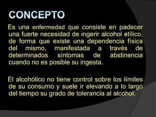 El alcoholismo esla consecuencia del consumo abusivo del alcohol y se