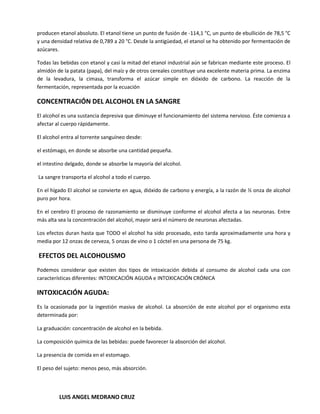 El documento trata sobre el alcoholismo. El alcoholismo es una enfermedad crónica causada por el consumo excesivo y prolongado de alcohol, que interfiere con la salud física y mental de la persona y sus responsabilidades. El alcoholismo se caracteriza por la dependencia emocional y física del alcohol y causa daño cerebral progresivo.