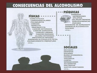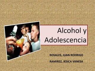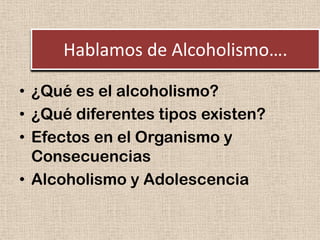 Este documento discute el alcoholismo y su relación con la adolescencia. Explica que el alcoholismo es una adicción crónica y progresiva que causa efectos destructivos. Identifica diferentes tipos de bebedores, desde abstemios hasta alcohólicos. Detalla los efectos del alcohol en el organismo. Finalmente, señala que la adolescencia es una etapa vulnerable para el alcoholismo debido a que el cerebro sigue desarrollándose hasta los 25 años de edad, lo que lo hace más susceptible a los efectos del alcohol.