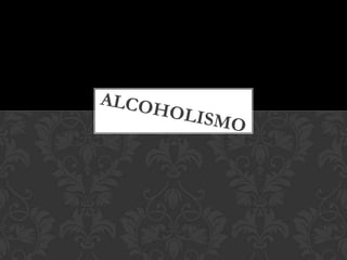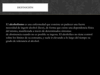 El alcoholismo es una enfermedad caracterizada por la dependencia física al alcohol y la incapacidad de controlar su consumo. Puede desarrollarse debido a factores genéticos y ambientales como el estrés. Los síntomas incluyen seguir bebiendo a pesar de los problemas de salud o familiares, abstinencia cuando no se bebe, y necesidad de más alcohol para sentirse ebrio. El alcoholismo tiene un grave impacto social al causar enfermedades hepáticas, accidentes y muertes prematuras.