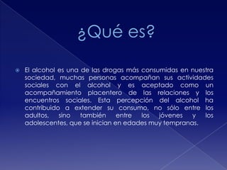 El alcohol es una droga ampliamente consumida en la sociedad, afectando tanto a adultos como a jóvenes, y su principal componente, el etanol, actúa como un depresor del sistema nervioso. Su consumo excesivo puede llevar a graves problemas de salud, incluyendo daños en el hígado y un incremento en el riesgo de ciertos tipos de cáncer, especialmente en mujeres, que son más susceptibles a los efectos del alcohol. En México, la prevalencia del consumo de alcohol en jóvenes es alarmante, con muchos comenzando a beber a temprana edad y con un notable porcentaje de accidentes de tráfico asociados al consumo de alcohol.