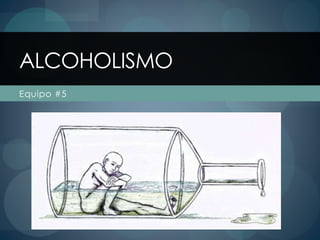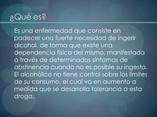 El documento describe el alcoholismo, incluyendo sus síntomas, tipos, factores de riesgo y consecuencias físicas y psicológicas. El alcoholismo es una enfermedad caracterizada por la dependencia al alcohol y la incapacidad de controlar su consumo. Sus síntomas incluyen seguir bebiendo a pesar de los problemas de salud, trabajo o familia. Las consecuencias físicas incluyen daños en el hígado, corazón y sistema nervioso central, mientras que las consecuencias psicológicas son depresiones, demencia