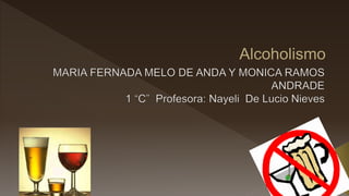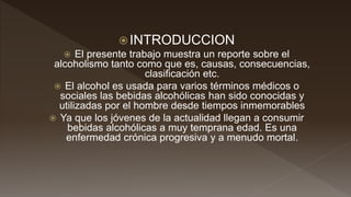 El documento habla sobre el alcoholismo. Explica que el alcoholismo es una enfermedad crónica progresiva que se caracteriza por la incapacidad de controlar la ingesta de alcohol. También discute las causas del alcoholismo como problemas familiares y emocionales, así como las consecuencias como desintegración familiar, enfermedades y accidentes. Además, describe los diferentes tipos de bebidas alcohólicas como tequila blanco, reposado y añejo.