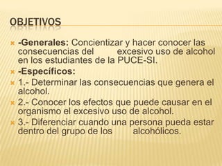 Este documento presenta los objetivos, métodos y resultados de un proyecto sobre el alcoholismo en los adolescentes. El proyecto busca concientizar sobre las consecuencias del consumo excesivo de alcohol en estudiantes y determinar los efectos en la salud y el estilo de vida de los jóvenes. Se realizaron encuestas que muestran que muchos empiezan a beber a temprana edad y tienen tendencia a la adicción.