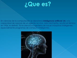 El documento define la inteligencia artificial como la capacidad de razonar de un agente no vivo. Explica que John McCarthy acuñó el término en 1956 y lo definió como la ciencia e ingeniería de hacer máquinas inteligentes, especialmente programas de cómputo inteligentes. Además, describe cuatro tipos de sistemas de inteligencia artificial: sistemas que piensan como humanos, sistemas que actúan como humanos, sistemas que piensan racionalmente y sistemas que actúan racionalmente.