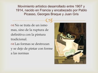 El cubismo fue un movimiento artístico desarrollado entre 1907 y 1914 en Francia por Pablo Picasso, Georges Braque y Juan Gris. Rompió con la pintura tradicional al destrozar las formas y dejar de pintar de acuerdo a las normas. Se trabajaba sobre planos geométricos y permitía mostrar figuras desde diferentes puntos de vista.