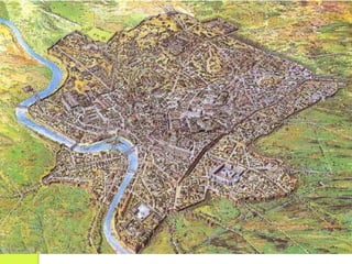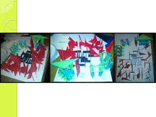 Esta maqueta muestra el crecimiento urbano de una ciudad a través del tiempo, con la ciudad expandiéndose gradualmente hacia los alrededores y reduciendo el espacio rural. Comenzó con un centro definido y luego se desprendieron varias edificaciones y calles que fueron dando forma a un patrón de crecimiento más complejo y disperso. Los planos y colores son los elementos clave para representar esta evolución urbana.