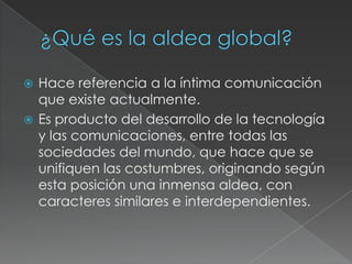 El documento habla sobre la teoría de la "aldea global" acuñada por Marshall McLuhan, la cual propone que debido al desarrollo de las comunicaciones y la tecnología, el mundo se está uniendo como una sola aldea interconectada donde las distancias se acortan y las personas de todas las sociedades pueden comunicarse e interactuar instantáneamente.
