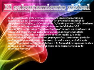 El calentamiento del clima es innegable según el aumento de la temperatura mundial del aire y el océano, la fusión generalizada de nieve y hielo, y el aumento del nivel del mar. El IPCC define el cambio climático como un cambio en el clima atribuible a causas naturales o humanas que persiste por décadas o más. El cambio climático incluye cualquier variación del clima a lo largo del tiempo.