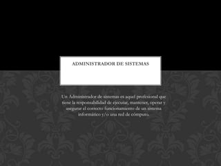 Este documento describe los roles de administrador de sistemas y analista de sistemas. Un administrador de sistemas se encarga del funcionamiento de sistemas informáticos y redes, generalmente después de estudiar ingeniería de software y redes. Un analista de sistemas analiza problemas y describe soluciones informáticas, aunque hoy en día también se encargan de gestión de proyectos y requisitos.