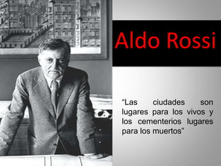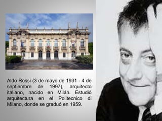 Aldo Rossi fue un arquitecto italiano nacido en 1931. En su obra planteó que las ciudades están compuestas de tres elementos: la trama urbana, el tejido y los monumentos. Defendió que las ciudades deben mantener su morfología a lo largo del tiempo aunque sus funciones puedan cambiar. Rossi también desarrolló un método de diseño basado en la descomposición y recomposición de elementos arquitectónicos llamados "piezas".