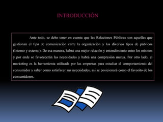 Este documento describe las relaciones públicas y el marketing. Explica que las relaciones públicas gestionan la comunicación entre una organización y sus públicos internos y externos, mientras que el marketing estudia el comportamiento del consumidor para satisfacer sus necesidades. También presenta cuatro modelos de relaciones públicas y cómo estas se relacionan con modelos de sociedad como el colonialismo, socialismo y capitalismo.