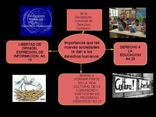 El documento describe las sociedades del conocimiento y la brecha digital. Resalta que aunque se habla de una sociedad mundial de la información, muy pocos tienen acceso a Internet. Explica factores como los recursos económicos, la geografía, la edad, el sexo y el idioma que influyen en la brecha digital. Propone que la UNESCO y los centros comunitarios multimedia ayuden a reducir esta brecha para que todos tengan acceso a las herramientas tecnológicas.