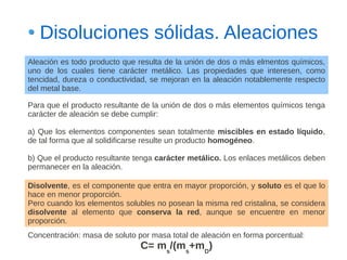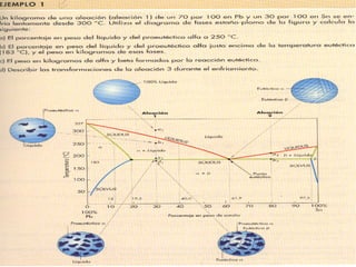 Este documento describe las aleaciones y sus diagramas de equilibrio. Explica que una aleación es la unión de dos o más elementos químicos, al menos uno de ellos metálico. Describe los tipos de estructuras cristalinas que pueden formar las aleaciones y los procesos de solidificación. También resume la regla de las fases de Gibbs y cómo se pueden usar los diagramas de equilibrio de fases para determinar las fases presentes en una aleación a diferentes temperaturas y concentraciones.