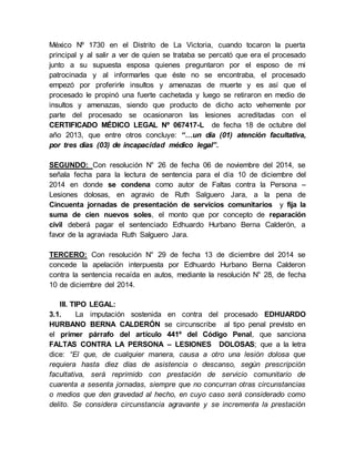 El documento presenta los alegatos de la defensora pública en un caso de lesiones dolosas. En primer lugar, solicita que se confirme la sentencia condenatoria contra el acusado por el delito de lesiones dolosas en agravio de la víctima. Luego, resume los hechos del caso, la tipificación legal correspondiente, y argumenta que los hechos han sido probados a través de la declaración de la víctima, un testigo, y el certificado médico. Finalmente, solicita que se tengan en cuenta estos alegatos al resolver el