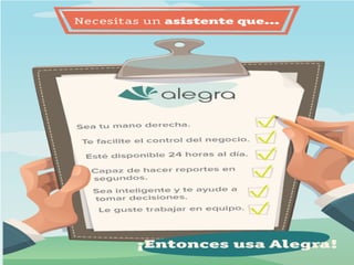 Alegra es un software que permite a las pequeñas y medianas empresas organizar y sistematizar sus procesos diarios, crear facturas, visualizar transacciones y evaluar resultados de forma fácil. El software facilita la administración y facturación desde cualquier lugar y en cualquier momento, ya que permite acceder a la información desde casa o el celular. Alegra siempre se actualiza y alienta a seguirlos en redes sociales para mantenerse informado.