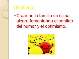 Este documento habla sobre la alegría y cómo cultivarla en la familia. Define la alegría como una disposición positiva y optimista que permite disfrutar más de la vida. Explica que la alegría depende de valores internos como el humor y la capacidad de afrontar positivamente los problemas, no de las circunstancias. Da el ejemplo de una familia que mantiene la alegría a pesar de las dificultades centrándose en lo positivo. Finalmente, ofrece consejos para cultivar la alegría en personas de diferentes edades como apreci