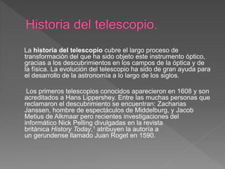 El documento habla brevemente sobre la historia del telescopio. Explica que los primeros telescopios aparecieron en 1608 y fueron creados por Hans Lippershey, aunque otros también reclamaron el descubrimiento. Estos primeros telescopios refractores consistían en un lente convexo y otro cóncavo. Galileo luego utilizó este diseño.