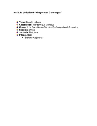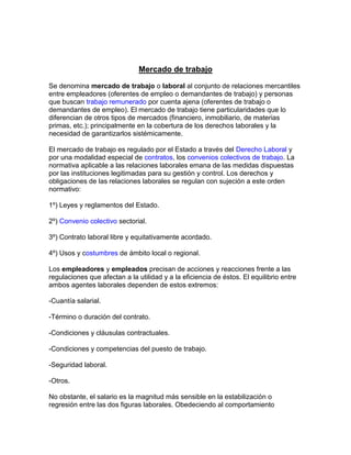 El documento habla sobre el mercado laboral y el derecho laboral. Explica que el mercado laboral es el conjunto de relaciones entre empleadores y personas que buscan trabajo, y que está regulado por el estado a través de leyes laborales y convenios colectivos. También menciona algunos indicadores del mercado laboral como el desempleo, subempleo e índices salariales. Finalmente, señala que el derecho laboral tutela las relaciones laborales para equilibrar la desigualdad entre empleadores y trabajadores.