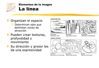 Este documento trata sobre los elementos básicos de la imagen en el diseño gráfico, incluyendo la línea, las formas, la luz, el color y cómo funciona la visión humana. La línea organiza el espacio y crea texturas y profundidad. Las formas básicas como el cuadrado, triángulo y círculo definen y organizan el espacio. La luz modela formas y sugiere profundidad. El color se define por su tono, saturación y luminosidad. La visión humana se basa en receptores en la retina