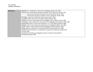El documento presenta la asignatura de Historia de la Educación que forma parte de la carrera de Pedagogía. Incluye la introducción a la asignatura, los objetivos, unidades temáticas, forma de trabajo, criterios de evaluación, referencias bibliográficas y calendario. La asignatura analizará la práctica educativa a lo largo de la historia desde una perspectiva social, identificando cambios en el rol del pedagogo.