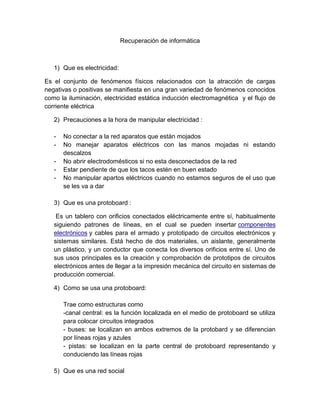 Este documento trata sobre conceptos básicos de electricidad e informática. Explica que la electricidad se refiere a la atracción de cargas positivas y negativas, y ofrece precauciones para manipular aparatos eléctricos de manera segura. También define una protoboard como un tablero que permite ensamblar circuitos electrónicos de manera provisional, y describe algunas de sus características principales. Por último, brinda definiciones breves de redes sociales y tecnología en la nube.
