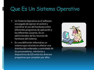 Este documento describe y compara varios sistemas operativos populares como Windows, Linux, DOS y Unix. Define un sistema operativo como el software que controla y coordina el uso del hardware entre programas y usuarios. Explica brevemente cómo funcionan estos sistemas operativos y concluye que son importantes para facilitar el uso de computadoras e informática.