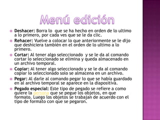 Este documento describe las diferentes herramientas y comandos disponibles en PowerPoint. Incluye comandos para editar, formatear y insertar elementos como deshacer, rehacer, cortar, copiar, pegar, hipervínculos, buscar y reemplazar. También describe las diferentes vistas como diapositiva, esquema y clasificador. Finalmente, explica cómo insertar elementos como imágenes, videos, gráficos y cuadros de texto.