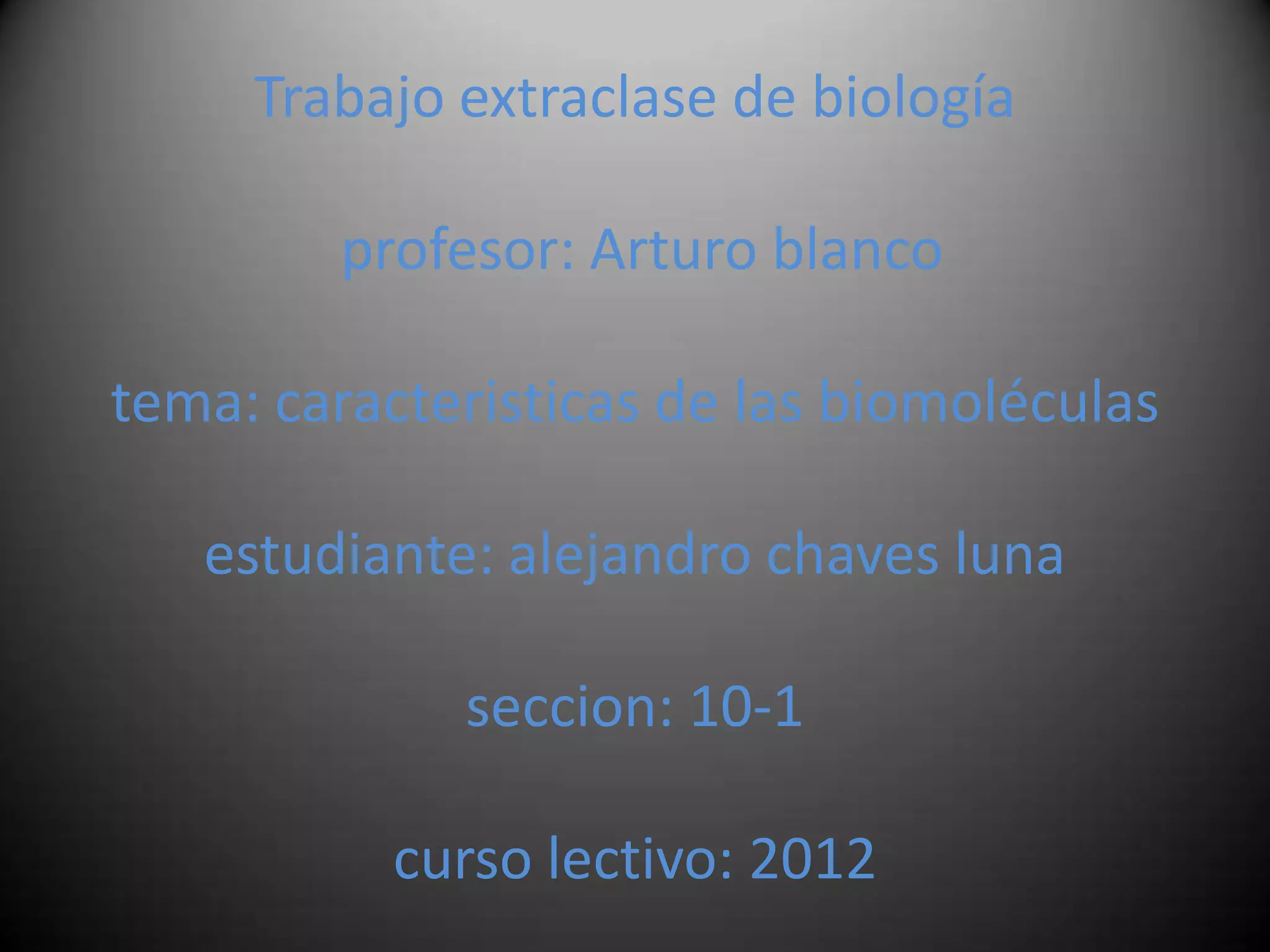 Este documento presenta las características básicas de las biomoléculas como carbohidratos, lípidos, proteínas, ácidos nucleicos y vitaminas para el curso de biología del estudiante Alejandro Chaves Luna en el año lectivo 2012.