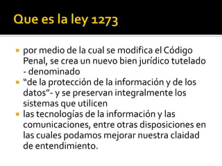 El documento presenta una propuesta para modificar el Código Penal colombiano para crear nuevos delitos relacionados con la protección de la información y los datos. Propone penas de prisión de hasta 120 meses y multas de hasta 1,500 salarios mínimos por delitos como acceso abusivo a sistemas, daño informático, uso de software malicioso y violación de datos personales. El objetivo es disuadir estos delitos mediante el establecimiento de altas sanciones penales y jurídicas.