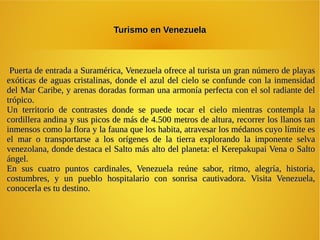 El primer documento describe el turismo en Venezuela, destacando sus playas de aguas cristalinas y arenas doradas, así como sus paisajes que incluyen la cordillera andina, los llanos y la selva amazónica. El segundo documento explica que el turismo moderno comenzó con un viaje organizado a los Alpes suizos en 1863, y que en 2012 más de mil millones de personas viajaron a nivel mundial. El tercer documento proporciona definiciones de turismo y resume brevemente su historia.