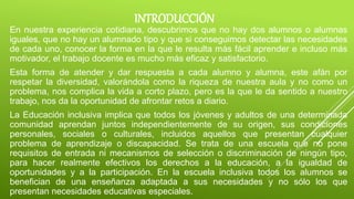 Este documento discute la inclusión en las aulas de clase. Argumenta que cada estudiante es único y que al conocer sus necesidades individuales, la enseñanza es más efectiva. Define la educación inclusiva como aquella que permite que todos los jóvenes aprendan juntos independientemente de sus antecedentes o capacidades. El documento también explora conceptos como la discapacidad intelectual, la calidad de vida, la ciudadanía plena y la misión de educar para la vida y la comprensión humana.