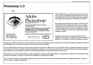 El documento describe la evolución de Adobe Photoshop desde su creación en 1987 hasta la versión más reciente. Comenzó como un programa para mostrar imágenes en escala de grises pero se convirtió en un potente editor de imágenes tras ser adquirido por Adobe. Características como las capas, ajustes, filtros y mejoras en el rendimiento lo han convertido en el estándar de la industria para la edición y retoque de fotografías.