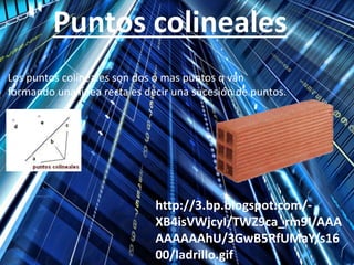 Este documento presenta información sobre varias figuras geométricas, incluyendo puntos colineales, segmentos, bisectrices, triángulos (escaleno, acutángulo), cuadrados, esferas, conos y más. Define cada figura y proporciona ejemplos visuales para explicar sus características.