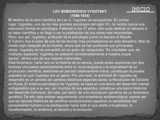 El documento presenta breves biografías de seis destacados psicólogos del desarrollo: Lev Vygotsky, Jean Piaget, David Ausubel, Robert Gagné, Jerome Bruner y Robert Gagné. Vygotsky fue pionero en el estudio sociocultural del desarrollo, Piaget estudió las etapas cognitivas en niños, mientras que Ausubel, Gagné, Bruner y otros hicieron contribuciones importantes a la psicología educativa.