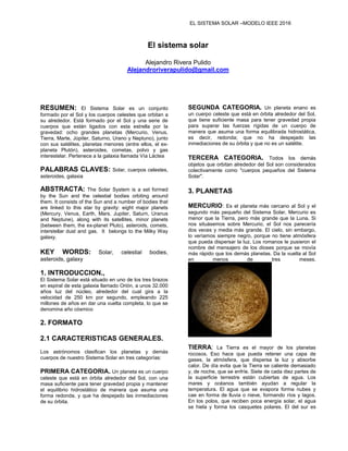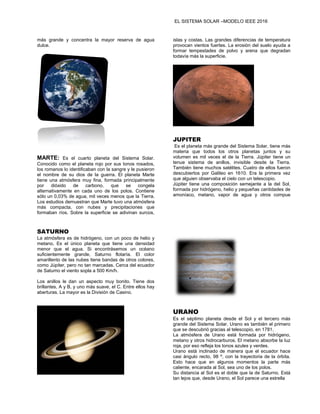 El Sistema Solar está formado por el Sol y los cuerpos celestes que orbitan a su alrededor, incluyendo 8 planetas, sus satélites, planetas enanos como Plutón, asteroides y cometas. Pertenece a la galaxia de la Vía Láctea y contiene planetas rocosos como la Tierra y Mercurio, y planetas gaseosos como Júpiter, Saturno, Urano y Neptuno.