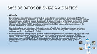 El documento describe la historia y conceptos clave de las bases de datos orientadas a objetos. Explica que surgen para superar las limitaciones de los modelos de datos anteriores y facilitar el desarrollo de aplicaciones. Detalla los principales conceptos como identidad de objetos, herencia y polimorfismo. También analiza las ventajas como la capacidad de modelado y desventajas como la falta de estándares. Finalmente, contrasta las diferencias entre el modelo relacional y orientado a objetos.