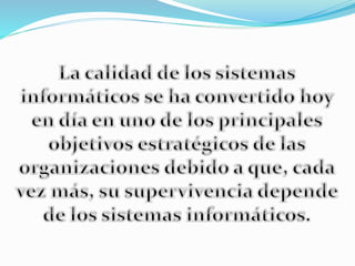 El documento aborda la calidad de los sistemas de información, destacando que esta se basa en aspectos como la satisfacción de las necesidades del usuario y la organización, la estandarización de métodos, y la optimización del uso de hardware y software. Se explican las propiedades y características que debe tener un sistema para funcionar correctamente y alcanzar sus objetivos. Además, se citan recursos adicionales para ampliar la comprensión sobre el tema.