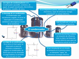 El documento describe el condensador, un dispositivo eléctrico que puede almacenar energía en un campo eléctrico entre dos placas conductoras. Explica que cuando se introduce un condensador en un circuito eléctrico, se comporta como un elemento capaz de almacenar energía eléctrica. También describe cómo se carga un condensador cuando se cierra un interruptor, permitiendo que pase corriente hasta alcanzar su carga máxima, y cómo se descarga a través de una resistencia cuando también se cierra un interruptor. Finalmente,